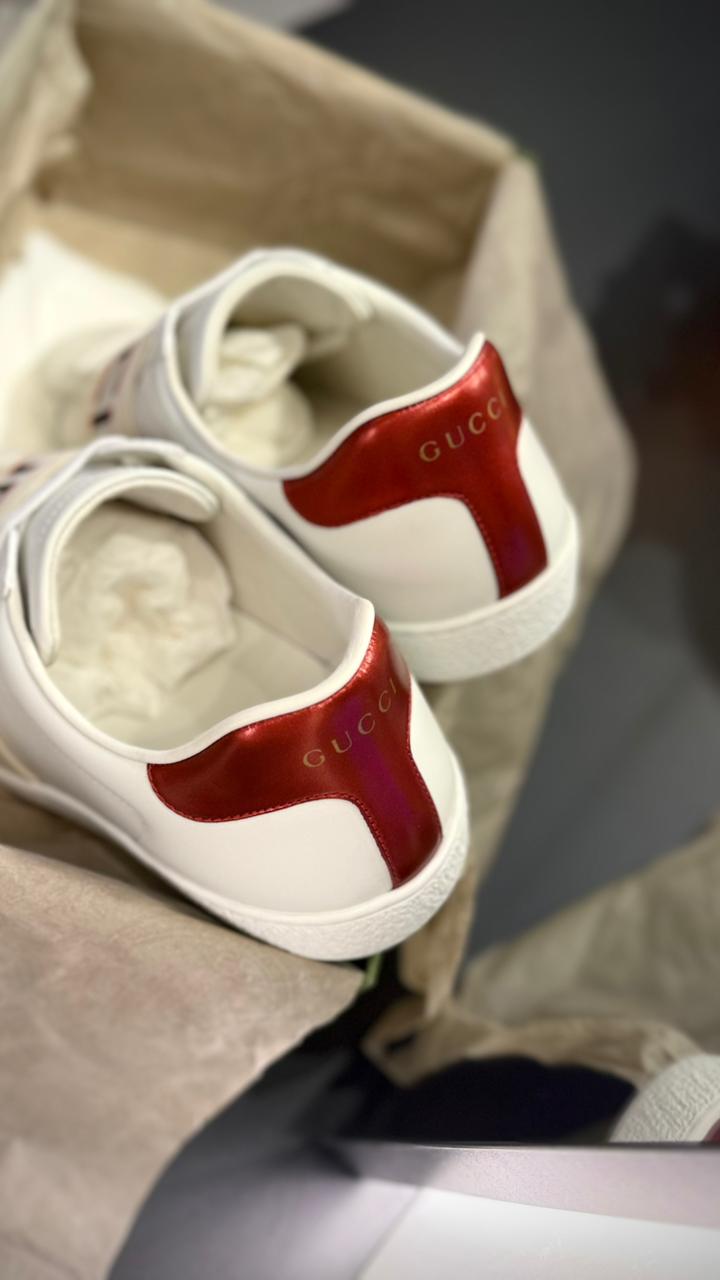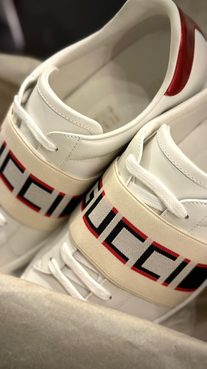 Cor predominante: clássica branca, com detalhes icônicos da Gucci, como o bordado da abelha ou listras laterais, dependendo da versão.