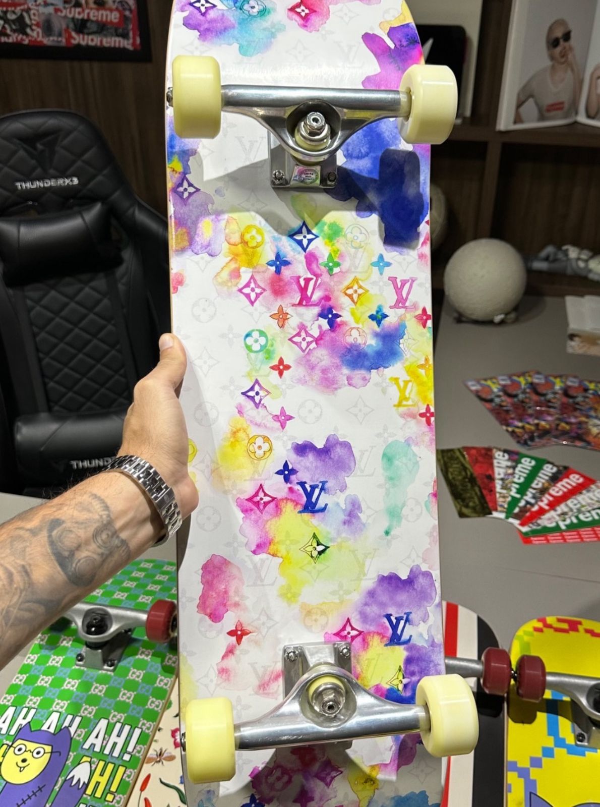 O skate Louis Vuitton assinado por Virgil Abloh é muito mais que um acessório esportivo — é uma verdadeira obra de arte. Parte da icônica coleção Watercolor Monogram, a peça traduz a visão disruptiva de Abloh: unir o universo do streetwear ao luxo tradicional da maison francesa.